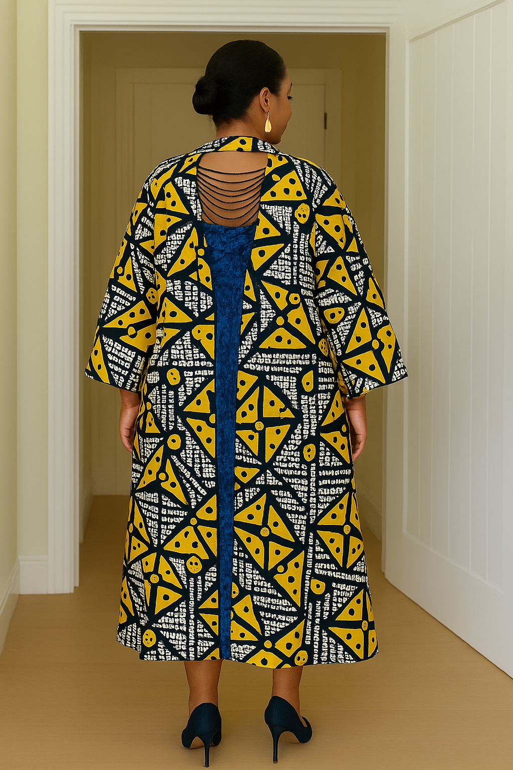 A flowing kimono jacket with vibrant geometric prints, offering effortless movement and regal flair.